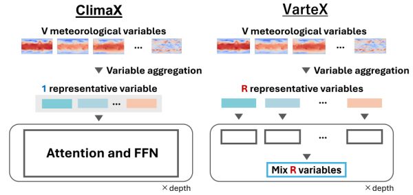 We propose a new approach called VarteX, which efficiently represents and integrates multiple weather variables. Experimental results show that VarteX achieves higher forecasting accuracy with a smaller model size, enabling accurate predictions even under limited computational resources.