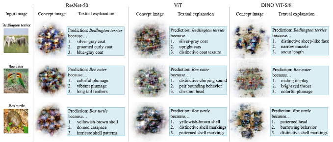 This paper proposes TEXTER, a zero-shot method for explaining the decisions of image classifiers in natural language. TEXTER extracts internal features that directly contribute to a model’s prediction, visualizes them as concept images, and then translates them into textual explanations. By grounding explanations in decision-critical internal features, TEXTER produces descriptions that are faithful to the classifier’s actual reasoning process. Experiments on ImageNet and PASCAL VOC demonstrate that TEXTER provides more faithful explanations than existing methods. The figure below illustrates examples of concept visualizations extracted by TEXTER and their corresponding natural language explanations.