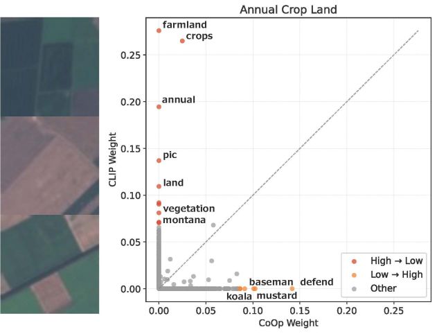 本論文では,視覚言語モデルにおけるプロンプト学習のブラックボックス性を解消するため,学習前後のプロンプト埋め込みを自然言語概念の疎な線形結合として分解する手法 PromptSpLiCE を提案する.CoOp を対象とした分析により,プロンプト学習は新たな概念を獲得するのではなく,既存概念の活性度分布を再編成する過程であり,その変化量が分類精度の向上と正に相関することを示した.下図は,EuroSAT データセットの例を用いて,プロンプト学習前後で言語概念がどのように変化するかを示している.
